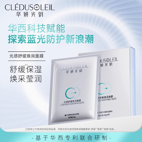 华妍光钥成功转化的抗蓝光专利技术如“光盾”一般,防护人造光损。华妍光钥光感系列,专注皮肤光防护,有面霜、眼霜、次抛精华、面膜等产品。其中,光感舒缓焕润面膜,添加依克多因,源自沙漠盐湖,协同抗光老。水解透明质酸钠与精氨酸,两种成分补水保湿,马齿苋提取物则可舒护光损泛红。